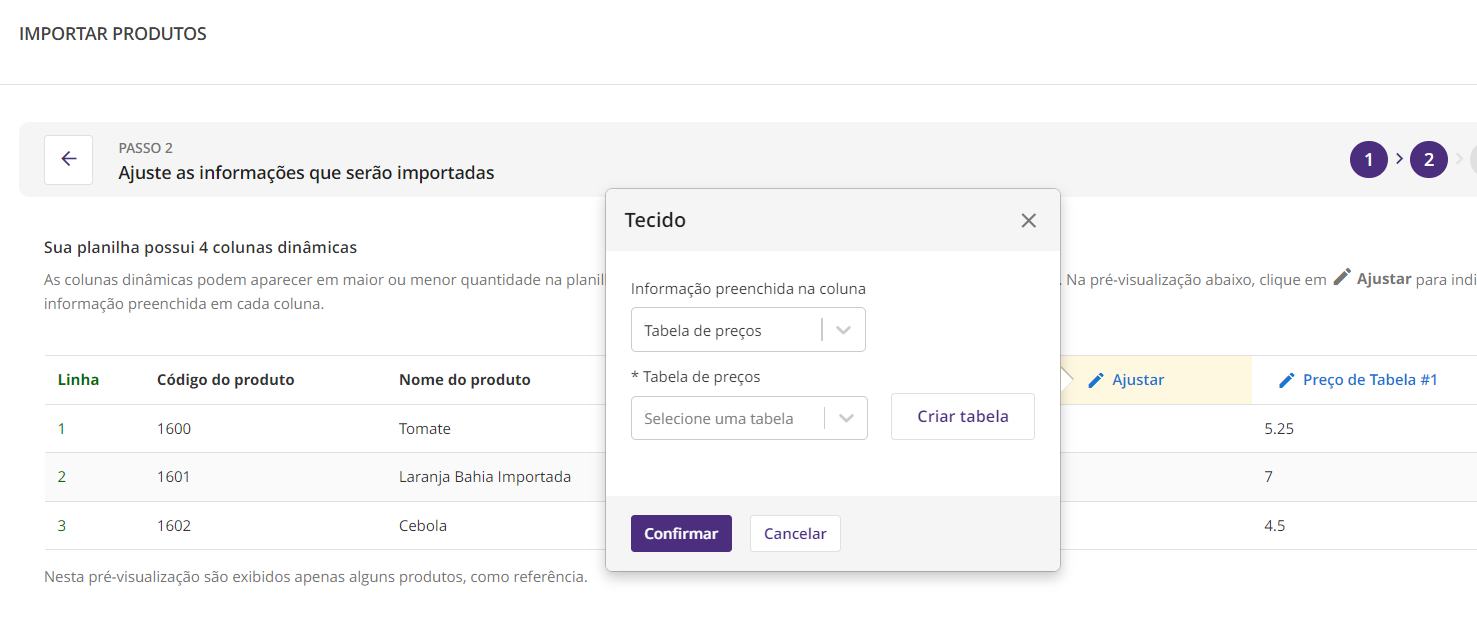 - No Passo 2, é necessário vincular as variações e tabelas de preço que estão sendo utilizadas nos produtos da planilha.